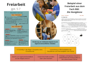 Die Freiarbeit setzt sich aus Pflichtaufgaben der Hauptfächer sowie aus Wahlaufgaben aller Fächer zusammen. Dadurch erfolgt eine Verzahnung zwischen Fachunterricht und Offenem Unterricht.