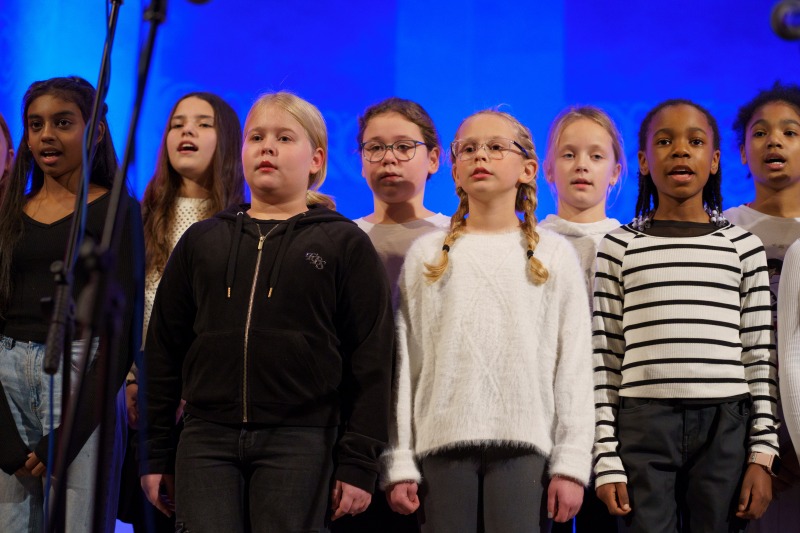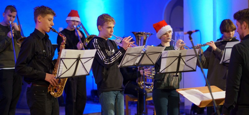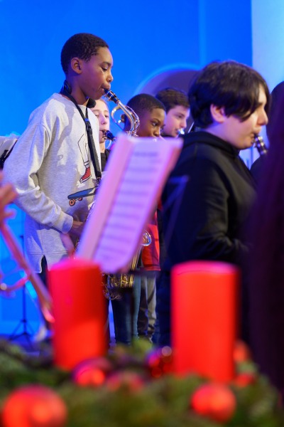 So gelang es den Bläserklassen, den Big Bands, dem Unterstufen- , dem Mittelstufen- , dem neu gegründete Lehrer*innenchor und der Schulband vor großem Publikum zu swingen, zu überraschen und stimmungsvoll zu bezaubern. Elias Lock und Leonie Meirowski aus der 9b führten mit einer gelungenen Moderation durch das Programm. Auch das Team der Aula Technik AG war wieder im Einsatz und sorgte mit seinem Lichtkonzept für eine tolle Atmosphäre und bei allen Ensembles für einen ausgewogenen Klang. In der Pause ermöglichte die Jahrgangsstufe Q1 eine Stärkung mit Kuchen und heißem Punsch.
