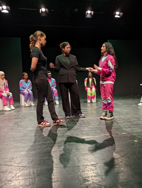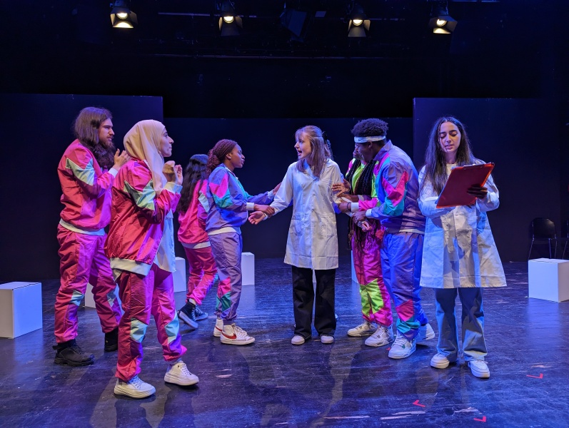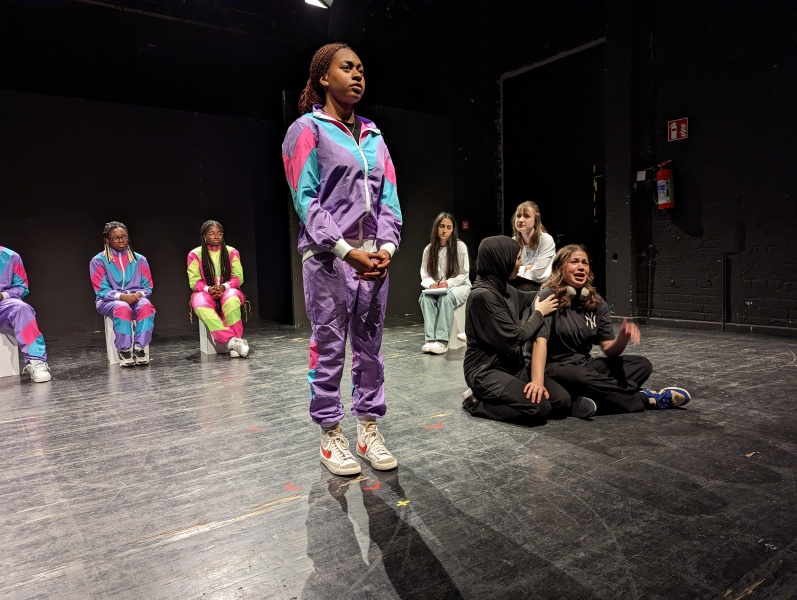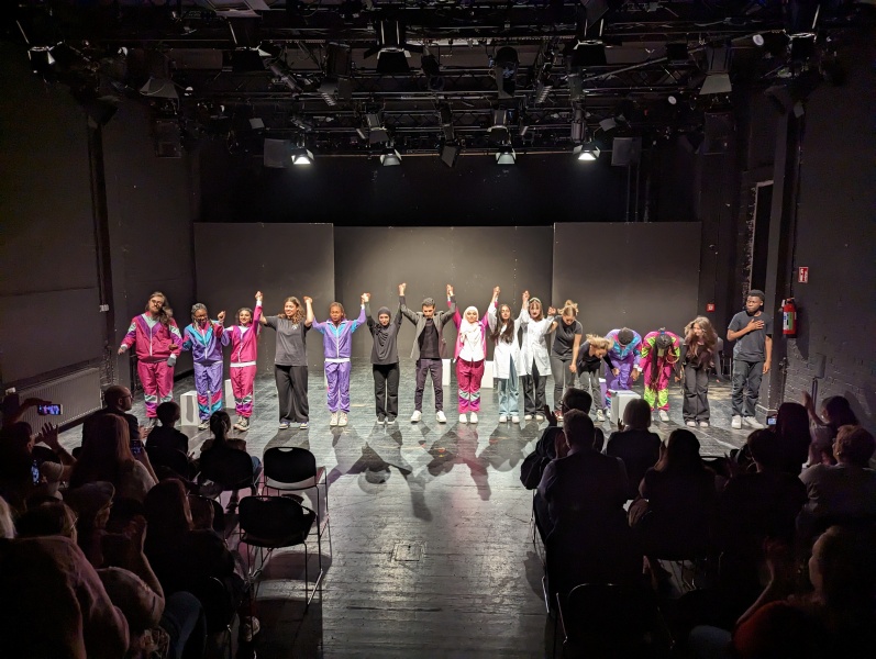 Doch nicht nur auf der Bühne konnten die Schüler:innen Theaterluft schnuppern: In zehn verschiedenen Workshops (von Bühnenkampf und Bühnenfechten über Schauspiel, Impro-Theater und Tanz bis hin zu Maskenbildnerei) probierten sie sich unter der Anleitung professioneller Schauspieler:innen, Tänzer:innen oder Maskenbildner:innen aus. Die Ergebnisse der Workshops wurden am letzten Abend präsentiert und es war erstaunlich zu sehen, was an nur drei Tagen von den schulübergreifend zusammengestellten Gruppen erarbeitet wurde. Am eindrucksvollsten war es aber wohl für alle Beteiligten, auch die Stücke der anderen Schulen zu sehen und diese in wertschätzenden Nachgesprächen zu reflektieren und durch kreative und spontan entwickelte „Szenengeschenke“ an die jeweilige Gruppe zu honorieren. Besonders die Tatasache, dass durch ein vom Bildungsbüro Oberhausen angeregtes Projekt vier der teilnehmenden Schulen Stücke zum Thema „Home. Heimat“ entwickelt hatten, machte den Austausch interessant. Insgesamt waren diese drei Tage zwar arbeitsintensiv und stellenweise auch anstrengend, sie werden allen Beteiligten aber wohl als unfassbar gewinnbringend und prägend im Gedächtnis bleiben.