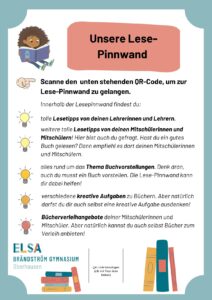 Am Elsa verfügt jede Klasse der Jahrgänge 5 bis 7 über eine eigene Lesepinnwand, die als zentrale Anlaufstelle rund ums Lesen dient. Dort finden die Schülerinnen und Schüler Lesetipps von Lehrkräften und Mitschülerinnen und Mitschülern, kreative Aufgaben sowie Hilfestellungen zur Vorbereitung ihrer Buchvorstellung, die jede Schülerin und jeder Schüler einmal pro Schuljahr im Deutschunterricht präsentiert. Zudem gibt es auf der Pinnwand eine freiwillige Buchverleihbörse, die zum Austausch und Entdecken neuer Lieblingsbücher anregt.