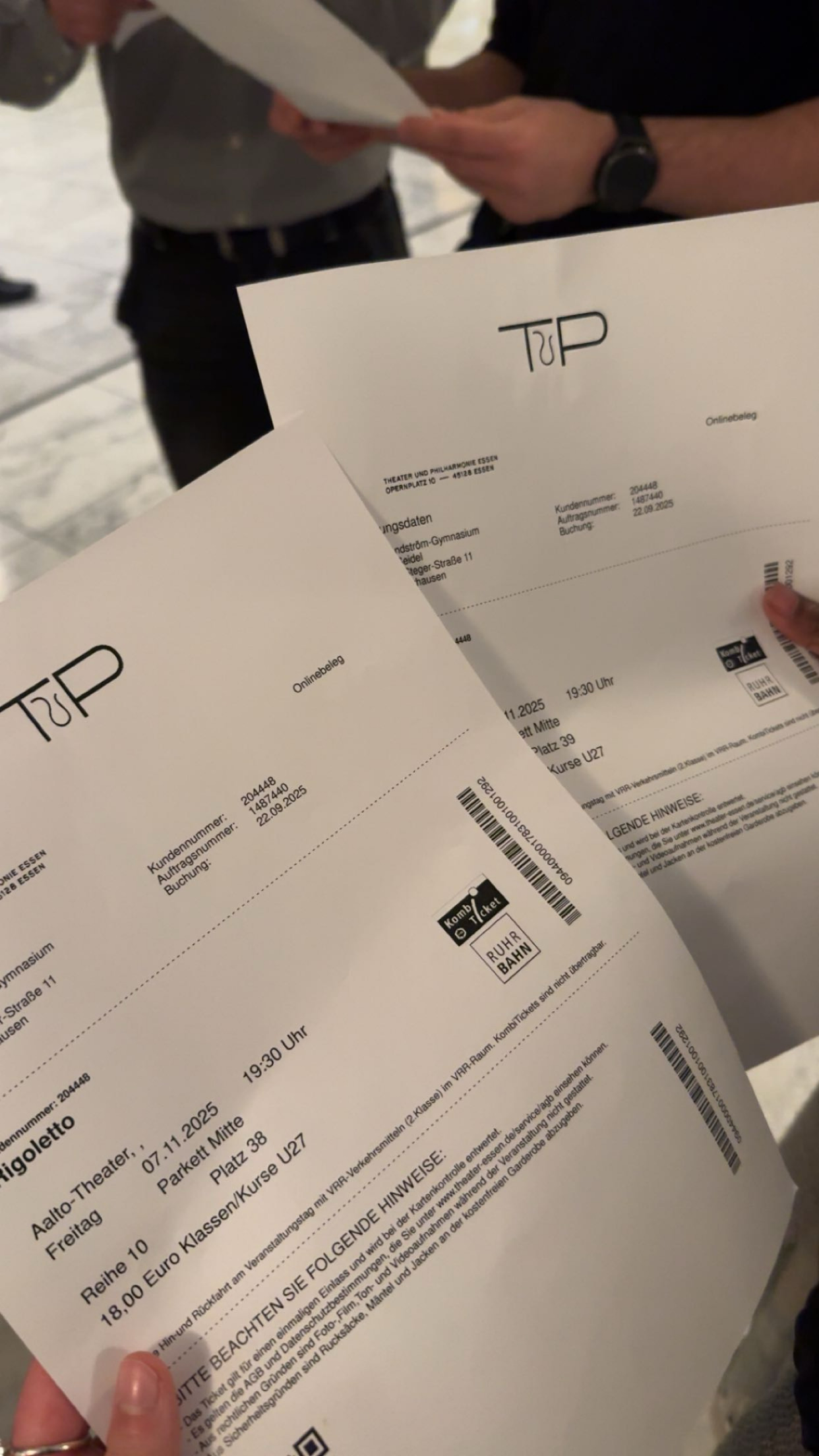 Der Musik-Grundkurs der Q2 von Frau Seidel betrat am Freitagabend, dem 7.11., eine Welt, die für die meisten Neuland war: die Oper. Ziel war das Essener Aalto-Theater, wo Verdis berühmtes Werk Rigoletto auf dem Spielplan stand. Für die meisten war es der erste Kontakt mit dieser Kunstform, und die Erwartungen schwankten im Vorfeld durchaus. Die Reaktionen nach der Vorstellung fielen dann umso positiver aus.